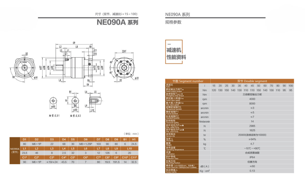 NE090A系列超精密背隙行星减速机系列(P0): NE090A系列精密背隙行星减速器系列(P1): NE090A系列标准背隙行星减速机系列(P2):