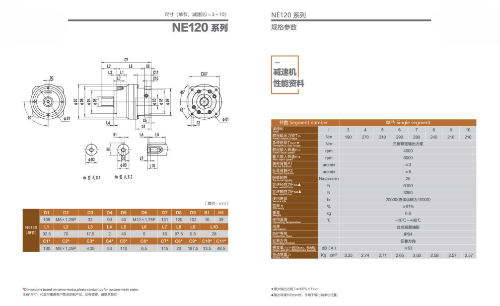 NE120系列超精密背隙行星减速机系列(P0): NE120系列精密背隙行星减速器系列(P1): NE120系列标准背隙行星减速机系列(P2):
