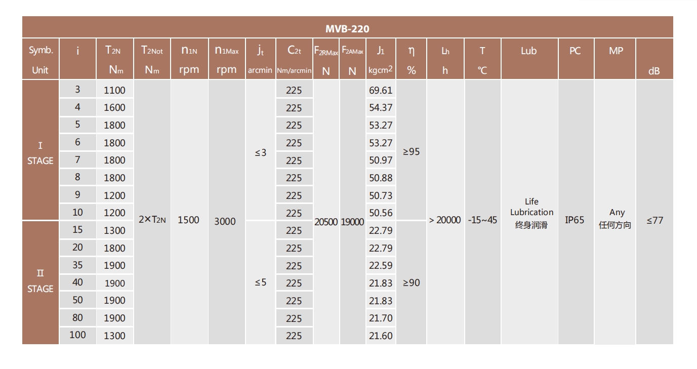 MVB-220-L2系列超精密背隙行星减速机系列(P0): MVB-220-L2系列精密背隙行星减速器系列(P1): MVB-220-L2系列标准背隙行星减速机系列(P2):