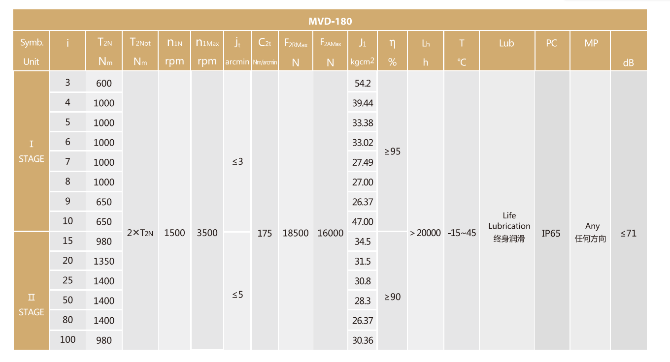MVD-180-L2系列超精密背隙行星减速机系列(P0): MVD-180-L2系列精密背隙行星减速器系列(P1): MVD-180-L2系列标准背隙行星减速机系列(P2):