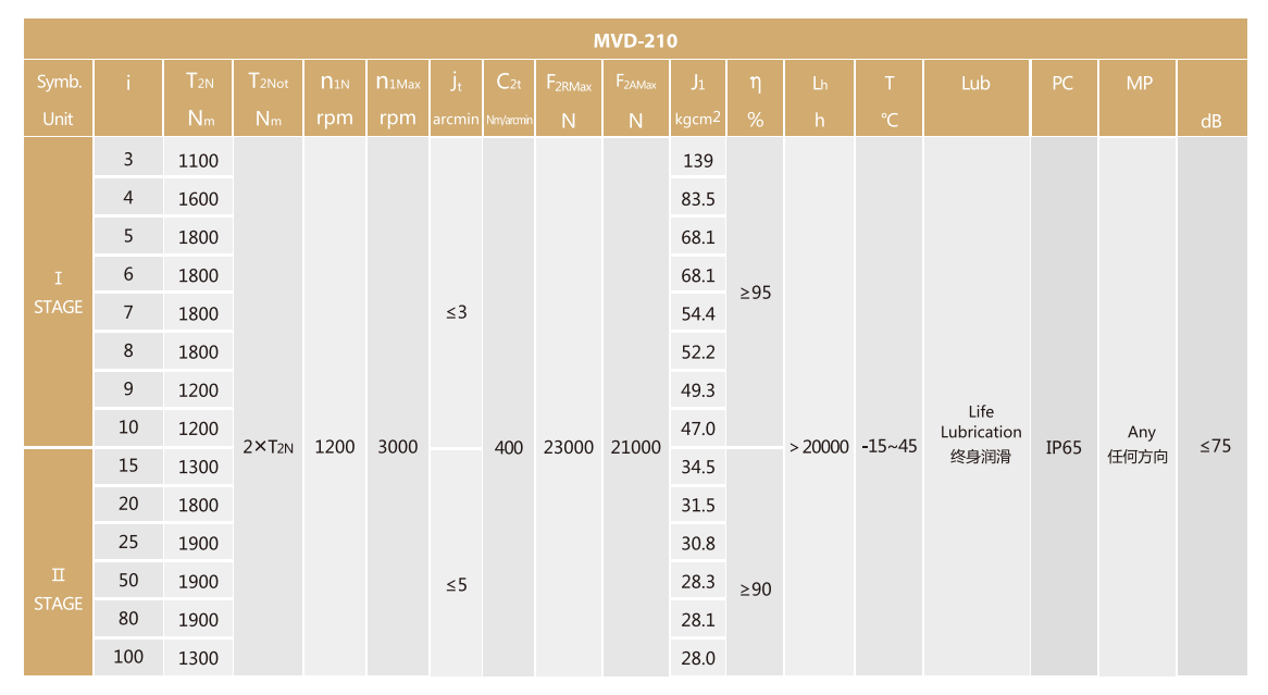 MVD-210-L1系列超精密背隙行星减速机系列(P0): MVD-210-L1系列精密背隙行星减速器系列(P1): MVD-210-L1系列标准背隙行星减速机系列(P2):