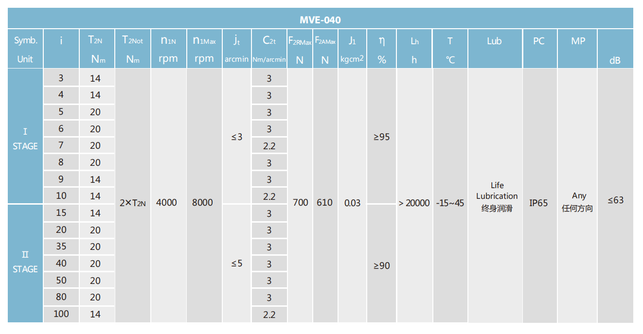 MVE-040-L1系列超精密背隙行星减速机系列(P0): MVE-040-L1系列精密背隙行星减速器系列(P1): MVE-040-L1系列标准背隙行星减速机系列(P2):