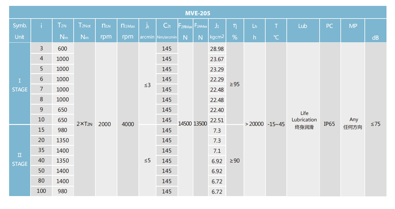 MVE-205-L1系列超精密背隙行星减速机系列(P0): MVE-205-L1系列精密背隙行星减速器系列(P1): MVE-205-L1系列标准背隙行星减速机系列(P2):