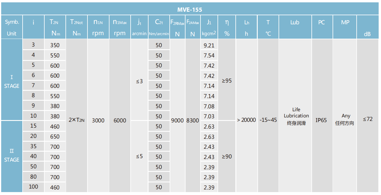 MVE-155-L2系列超精密背隙行星减速机系列(P0): MVE-155-L2系列精密背隙行星减速器系列(P1): MVE-155-L2系列标准背隙行星减速机系列(P2):