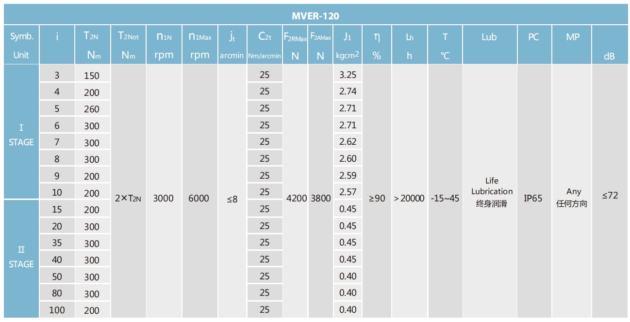 MVER-120-L2系列超精密背隙行星减速机系列(P0): MVER-120-L2系列精密背隙行星减速器系列(P1): MVER-120-L2系列标准背隙行星减速机系列(P2):