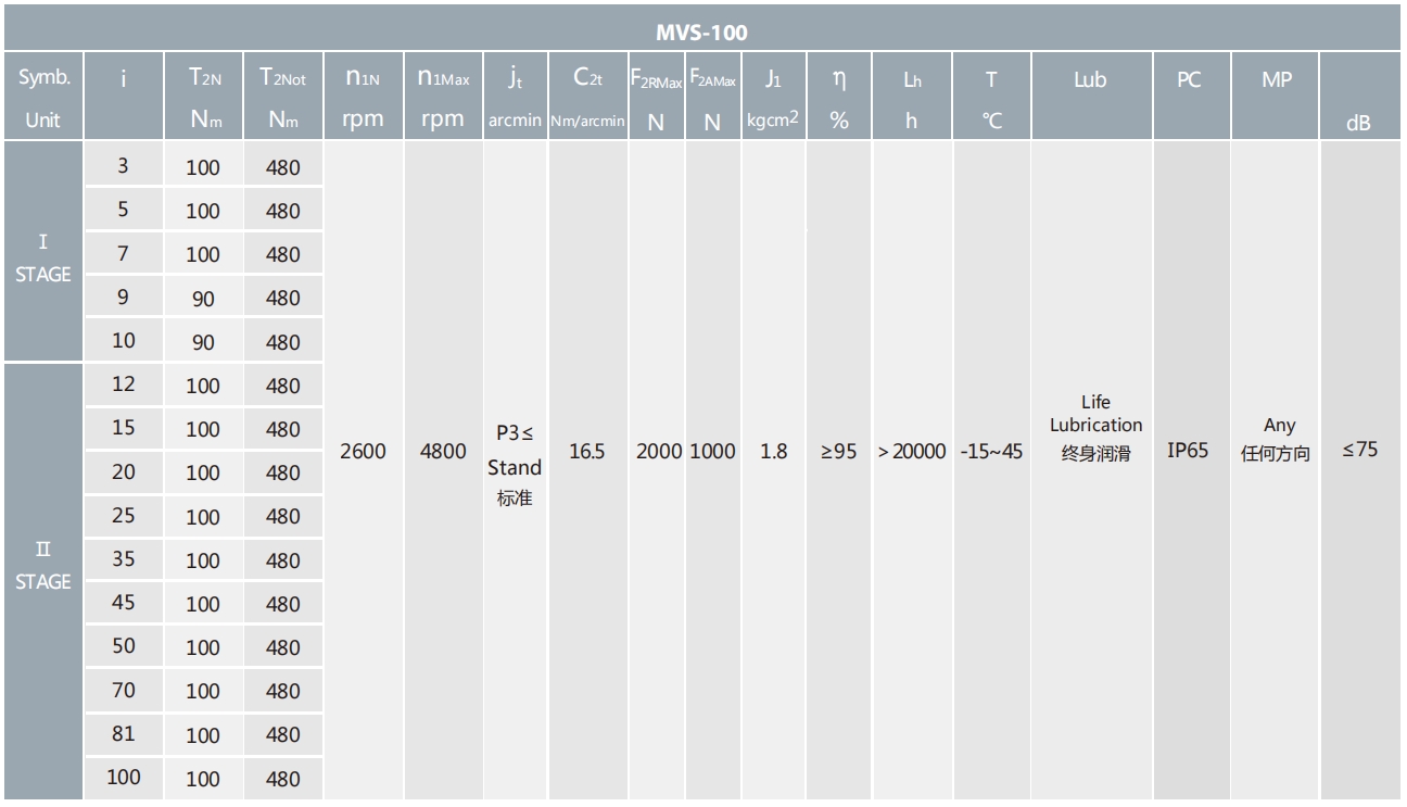 MVS-100-L1系列超精密背隙行星减速机系列(P0): MVS-100-L1系列精密背隙行星减速器系列(P1): MVS-100-L1系列标准背隙行星减速机系列(P2):