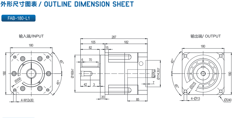 接下来给大家推荐一款客户反馈比较好的一款行星减速机:FAB180行星减速机属于FAB(R)行星减速机特点:减速机输出行星架,齿圈均采用分体式结构设计,减速机各项参数均匀良好,产品加工工艺采用与高端产品相同,并且采用相同的高精密加工设备制造,性价比高。减速机齿圈、行星架、输入轴均采用40Cr优质结构钢,经热锻加工工艺,从而获得更高的材料密度,比采用铸造箱体、圆钢等,具有更高强度刚性、韧性平稳运行、定位精度、进给力、功率密度、刚度、易于安装、设计方案多样、可扩展性。我们提供全方位的服务,从初始概念到设计、安装和调试,各个阶段都为您提供全程支持,并确保长期稳定地供应备件。筒式锁紧机构设计,确保在高输入转速下保证同心度和零侧隙动力传动。