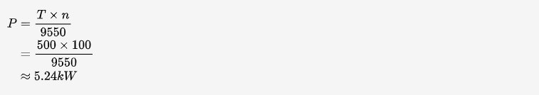例如,某设备需要输出扭矩为 500 N·m,输出转速为 100 r/min,则所需的功率为:
