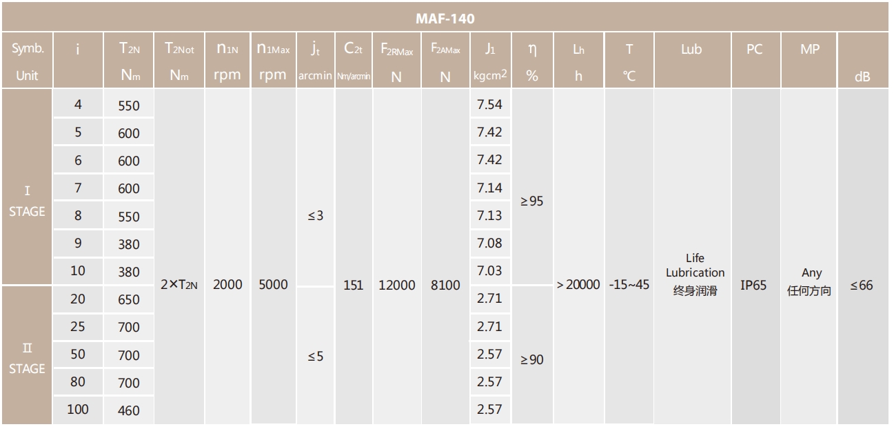 MAF-140-L1系列超精密背隙行星减速机系列(P0): MAF-140-L1系列精密背隙行星减速器系列(P1): MAF-140-L1系列标准背隙行星减速机系列(P2):