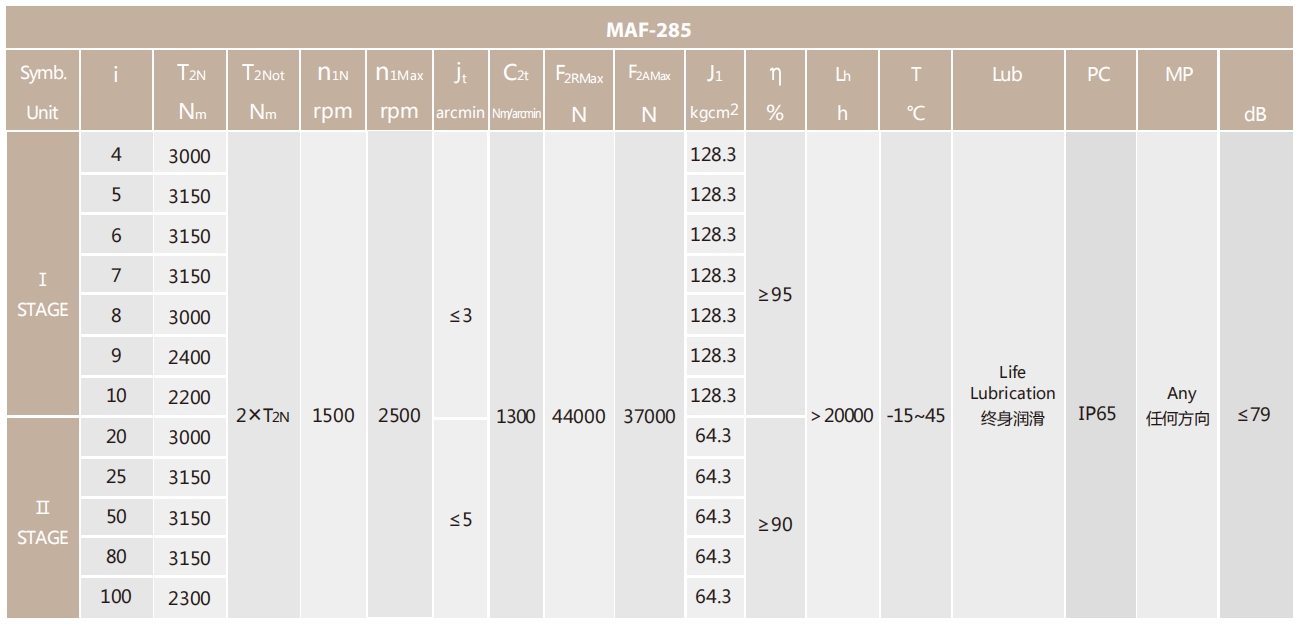 MAF-285-L1系列超精密背隙行星减速机系列(P0): MAF-285-L1系列精密背隙行星减速器系列(P1): MAF-285-L1系列标准背隙行星减速机系列(P2):