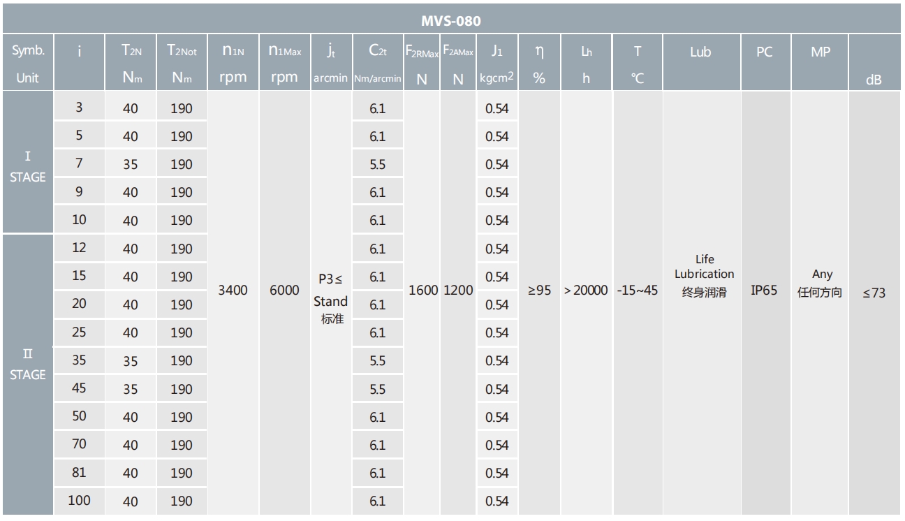 MVS-080-L1系列超精密背隙行星减速机系列(P0): MVS-080-L1系列精密背隙行星减速器系列(P1): MVS-080-L1系列标准背隙行星减速机系列(P2):